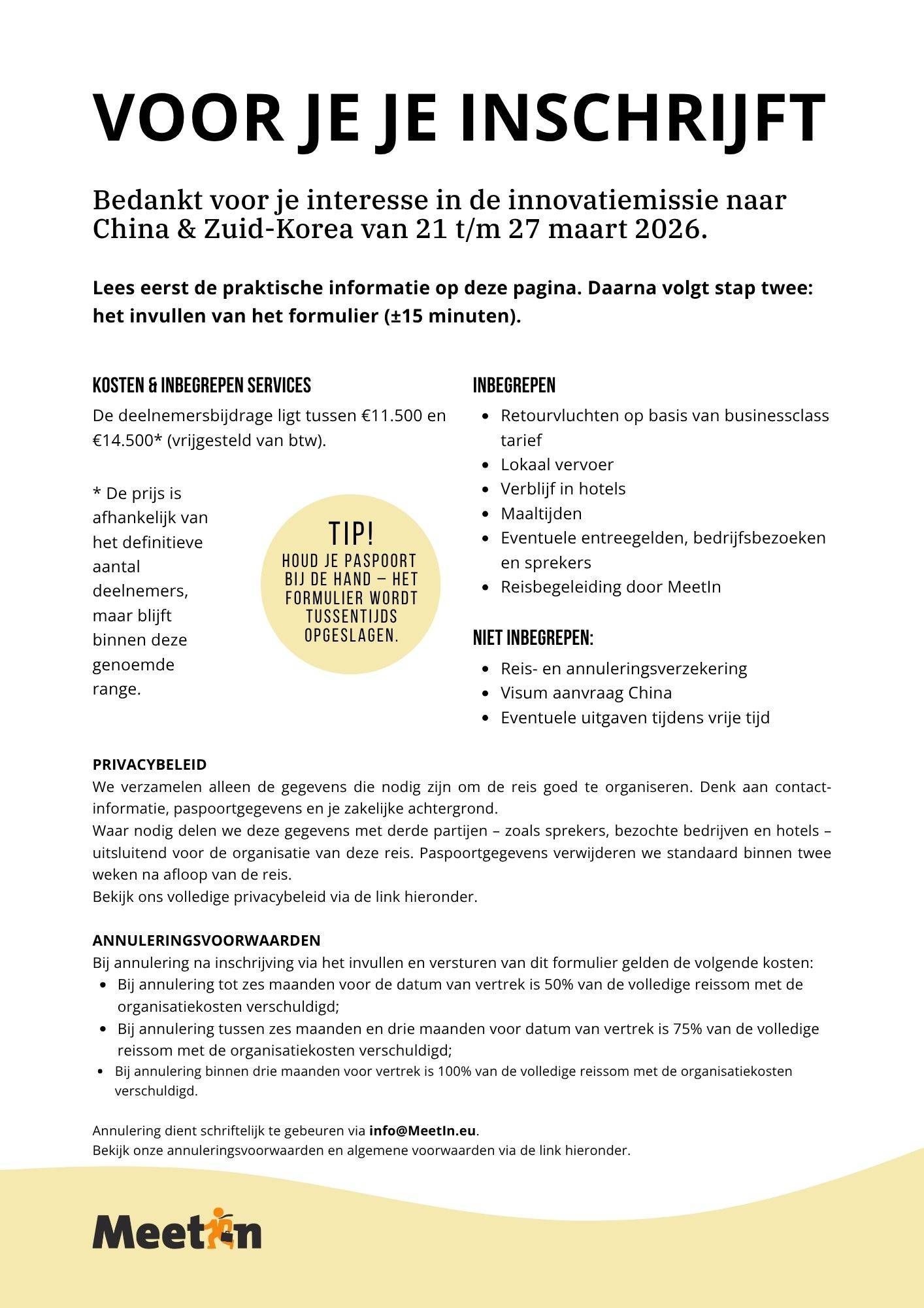 Deze ondernemersreis valt onder de garantieregeling VZR Garant. Je kunt de voorwaarden van deze garantieregeling vinden op de website van VZR Garant. MeetIn B.V. beschikt hiermee over de wettelijk verplichte bescherming om je terug te betalen en, indien het vervoer in de pakketreis is inbegrepen, te repatriëren ingeval van financieel onvermogen.